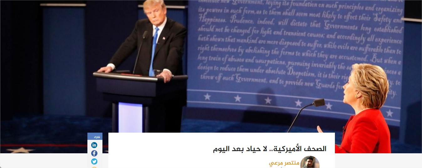 صحيفة الواشنطن بوست (تأسست عام 1877) اتخذت قرارا صريحا واستبقت موعد المناظرة الأولى بين دونالد ترامب وهيلاري كلينتون. كانت من عادة المناظرات التلفزيونية أن تغير من مواقف الناخبين المتأرجحة، وأن ترفع رصيد المرشح من النقاط أو تهوي به في استطلاعات الرأي. لكن الصحيفة التي استبقت المناظرة سددت ضربتها قبل أن يصعد الخصمان إلى حلبة الملاكمة، وقالت إنه لا يجب الانتظار لمشاهدة ترامب جديد قد يحسن التصرف أمام شاشات التلفاز. الواشنطن بوست لا ترى في ترامب مرشحا مناسبا لأن مسيرته حافلة بالتصرفات الهوجاء والإهانات والاتهامات التي لا يمكن أن تصدر عن مرشح لمنصب الرئيس. وإذا كانت الصحيفة أعلنت موقفها صراحة من ترامب إلا أنها لم تعلن دعمها لكلينتون لا سيما وأنه في معظم الولايات الأميركية يوجد مرشحين آخرين غير كلينتون وترامب ولكنهم لا يحظون بنفس القدر من الظهور في عالم الصحافة.